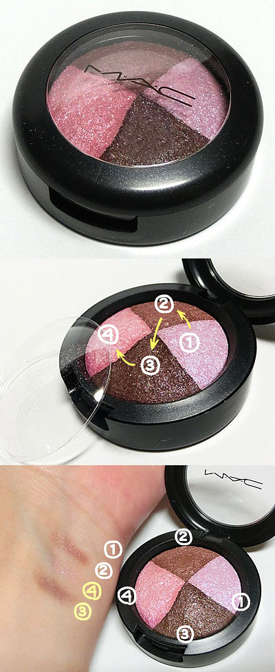 選んだカラーは、ピンク センシビリティーズ。 ピンクブラウン×パールピンク×チョコレートブラウン×イエローピンクの4色がセットになったものです。 写真はクリックで拡大しますので、よろしければm(__)m アイシャドウって自由な使い方で良いと思いますが、紹介していただいた付け方(?)を書いておきます。写真の番号は、使用順です。 【1】アイホール全体に1の色を塗ります。 【2】目のきわから広げるように、2を塗り広げて行きます。 【3】1と2の間に、3のカラーでグラデーションを作ります。 【4】仕上げに目頭部...