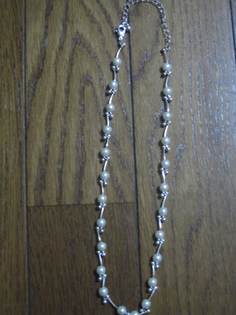 パールのネックレスです☆ノーブランドでもともと安いのですが、 バーゲンで安くなっていて、1200円くらいでした。 パールとパールの間の、シルバーの部分が、まっすぐじゃなくて、 ちょっと変わった形になっているので、地味になりすぎないデザインです☆こんな微妙な違いで、地味っぽくも華やかにもなるんだなーと感心。 黒の長袖タートルネックのセーターに、これをつけるだけで、シックで華やかな雰囲気になるので、アクセサリーって大事だなーと 感心しちゃいました。