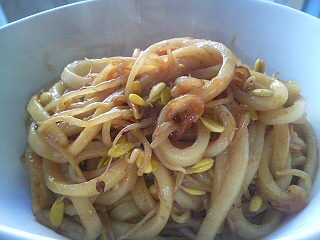 *フライパンにサラダオイルを熱してもやしを炒める。 *おうどんを入れてもやしと混ぜる。 *桜海老を入れてまぜる。 *オイスターソース大さじ2くらいと、 お醤油大さじ2くらいと、 辛いの(豆板醤など)を入れて混ぜる。 *程好く混ざったらごま油を全体に少したらす。 *出来上がり。まぁ簡単! もやしは、 食物繊維たっぷりです。 お豆が発芽したモノがもやしなので、 お豆の栄養を受け継いだ食べ物です。 しかしお豆は消化の悪さが難点。 でももやしになると胃腸に優しい食べ物に変わります。 アタシはコノ写真にあるよ...