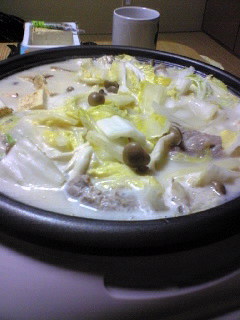 白菜,きのこ,白身魚,鶏肉,豆腐を入れました. スープは既製品を買いました. 豆乳臭くなくて,かつお風味でした. まろやかで子どもにも人気が出ると思います