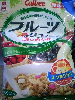 以前からフルーツグラノーラは大好きなのですが、 今回は「期間限定」に惹かれて即購入!(笑) 通常のフルーツグラノーラとは異なり、メープルシロップの 風味が絶妙♪ 原材料のひとつひとつがゴロゴロとしていて大粒のため、 噛み応えがあり、満腹中枢もちゃんと働きそう☆ 今年中にマイナス5圓目標なので、朝や時間がないときなど、 これを食べてダイエットに励みたいです☆(o・▽・o)ノ