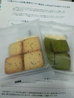 6月20日に荷物が届いた「何だろう?」と 思って受け取って開けて見た、(*・0・*)ワオ モニターに選ばれたんだ〜(。・ω・)(。-ω-)ぅんぅん 早速夕食から、試食してみました、(抹茶クッキー) 食事の30分前にクッキーを食べて少し満腹感を感じた もともと、夕飯では主食(ご飯)は食べないのでおかずと クッキーだ、朝はコーヒーに食パン(ジャム)一枚 だけのシンプルな食事だから、クッキーはなし 昼と夜に試食してみました、主人も少し食べて「うん 結構美味しいな〜」との感想w(0^__^0)w 結果はまだ、出てない...