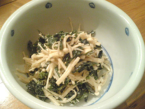 簡単!ヘルシー! ちっとも美味しそうに見えませんがだまされたと思って作ってみて下さい。 はまるの間違いなしですヽ(´∇`)ノ 材料 ・えのき一袋 ・乾燥わかめ一掴み (胡麻マヨにする場合) ・マヨネーズ ・醤油(出来ればにんにく醤油) ・すり胡麻たっぷり (おろしポン酢あえにする場合) ・ポン酢 ・大根おろしたっぷり 所要時間 6分 作り方 1) えのきはふたつに切りさっと洗う。 えのきと乾燥のままのわかめをレンジOKのボールにいれ 水を100cc程入れて、さっくりかき混ぜて4分チンす...