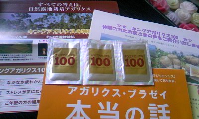 3日間 お試しモニターに当選して飲んでみました [キングアガリクス100]はブラジル厚生局認可の農場で、自然露地栽培された「アガリクス」を100%使用、自然露地栽培されたアガリクスは、非常に大きく育ち、病気などに対する抵抗力はハウス栽培物の約5倍以上も高めてくれると言われているそうです。[キングアガリクス100]は、日本国内の最新鋭工場で、添加物を一切加えず顆粒状に製品化されています。 疲れが取れない方やストレス、抵抗力の維持に女性の美容と健康に・・とまさに万能薬のようですね 初めは、えっ!粉?と思いました で...