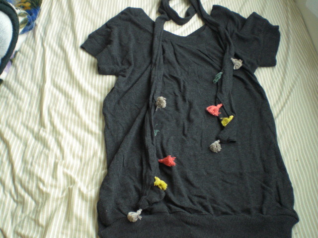 カラフルなポンポンがかわいいストール?に惹かれてバーゲンでゲット! 薄手のニットです。えり周りは丸首とVネックで 前後どちらでも着る事ができるので便利〜♪ 丈が結構長めなので、ワンピにもOK。 太ベルトでウエストを絞るとまた違う雰囲気に、とヘビロテアイテムです☆