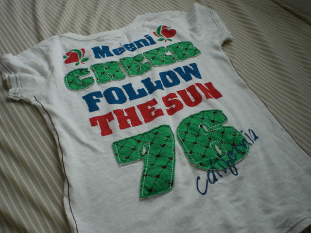 オリエンタルな服を置いているお気に入りのショップで見つけた 全然オリエンタルじゃないTシャツです(笑 フロントは胸にワンポイントがあるだけでシンプル。 写真はバックで、とってもポップな感じでカワイイ♪
