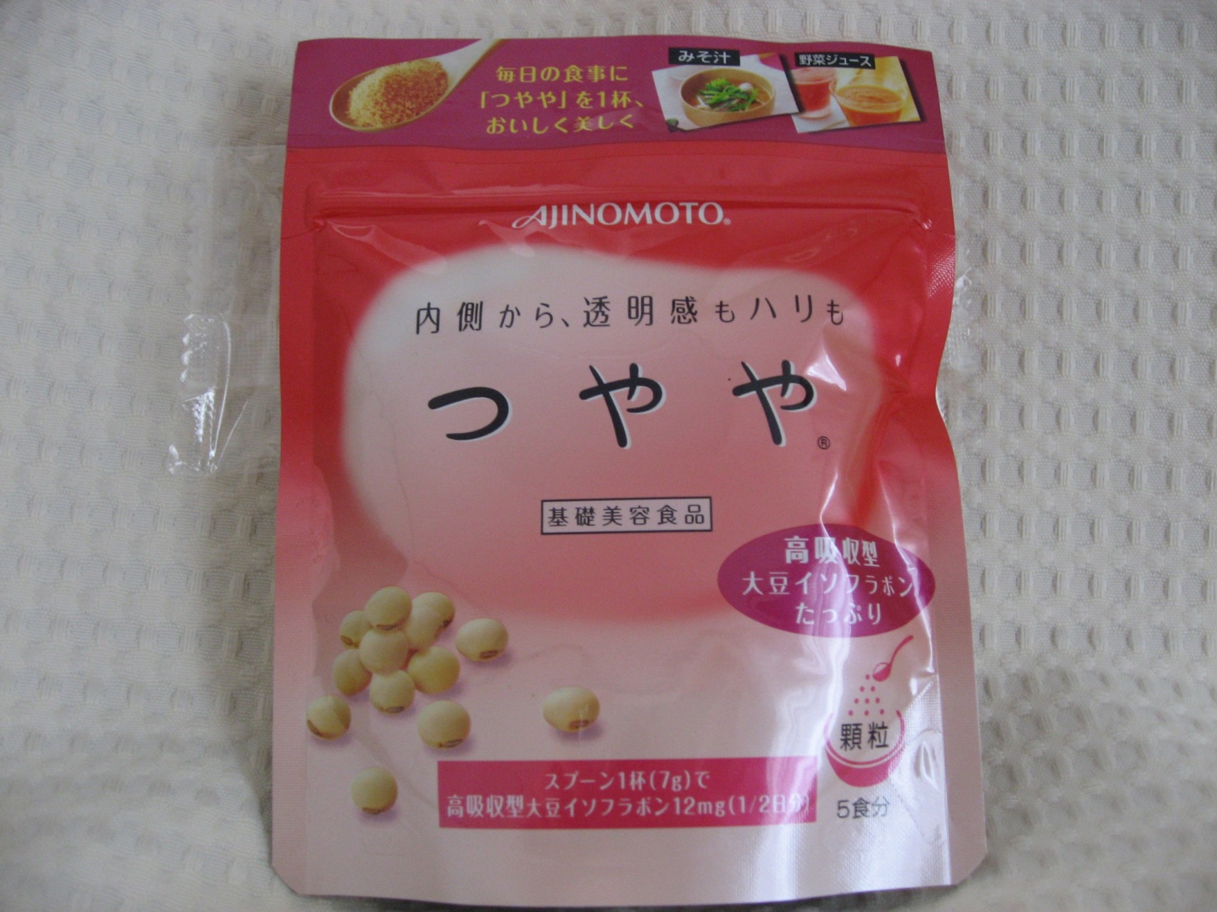 味の素さんから、モニターでいただきました。 ちょっとしょっぱい系のあじがあるので 野菜ジュースよりは、お味噌汁などスープものに 入れたほうがおいしくいただけます。 大豆イソフラボンのおかげで、お肌が美しくなるそうですが 心なしか、お肌にはりがでてきたような。 5食分のお試しでははっきりとした効果はでませんでした。 商品を購入して、続けてみようかな。