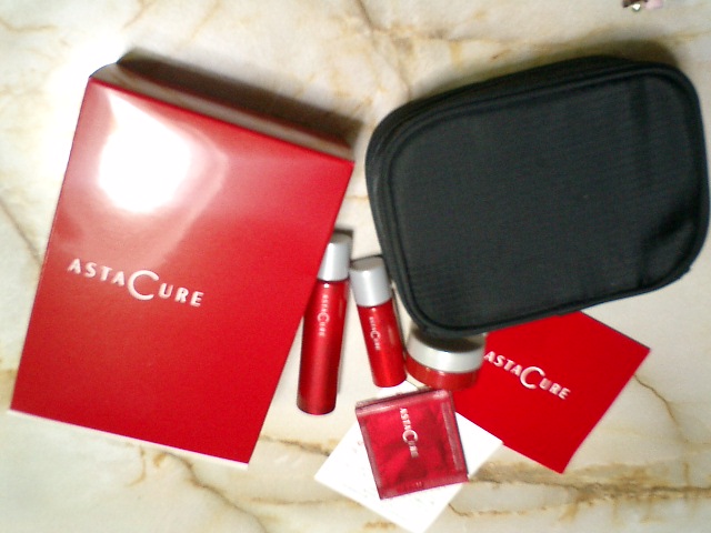 ローションとエッセンス、、クリームの3点セットに黒いポーチがセットになったトライアルセット 10日分のお試しです。 おまけにローションのサンプル6回分とアイクリーム1回分?もついていました(ローションはさっぱりとしっとりセットのものと違う) 基本はローションとエッセンスの2ステップスキンケアで サポートにクリームを使います。 アスタキュアと言うだけにアスタキサンチン配合でローションもエッセンスもオレンジ色をしています。 ローションは化粧水、エッセンスは美容液と書いてますが乳液のような感じです。...