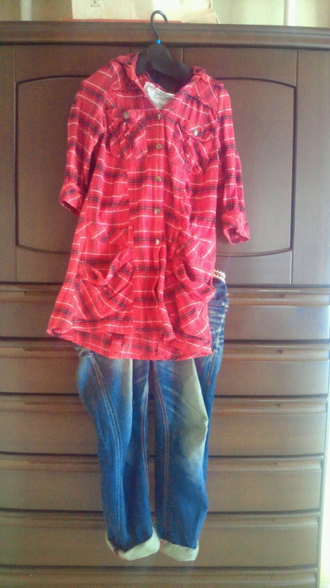 本日の私のコーデです。 定番のチェックワンピにデニムです。 気に入っています。