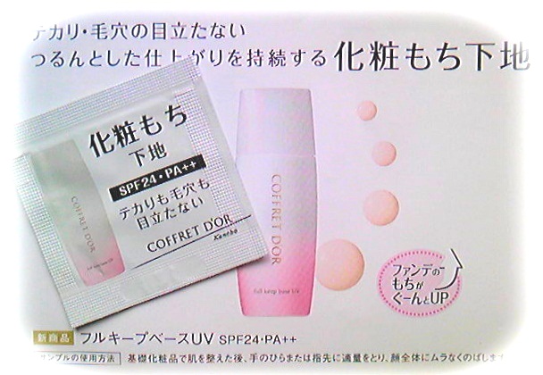 レース柄をあしらったケースが上品だけどかわいく感じ、気分もあがります♪ コフレドール フルキープベースUV を伸ばした肌にのせると きめ細かい、サラッとした感じに仕上がって、いい感じです! 薄付きでありながら、毛穴もものの見事に目立たなくなり嬉しい限り♪ また、配合されてるWの化粧もち成分(毛穴カバー持続成分*1・皮脂吸着成分*2) によってつけたての仕上がりを長時間キープの特徴どおり 朝メークして、夕方になっても化粧くずれしてなくてキレイなままでした! もう少し、汗ばむ季節にも良さそうです...