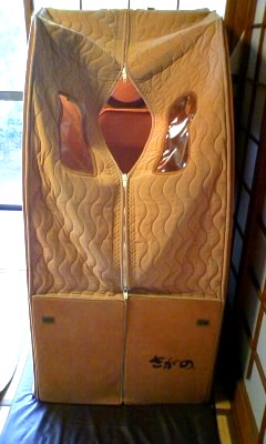 これは何?と思われるでしょう!これは『家庭用サウナ』です。 服を着たまま入れるサウナです。 遠赤外線によるまろやかな熱で身体を包み込みます。 さがののコンセプトは”頭寒足熱”です。 赤外線の働きにより身体の冷えを取り除き健康を維持する一助となります。 私は冷え症と肩こりが激しいのですが、この中に入ると体の芯から ポカポカになり、この冬、毎日入ると何ヶ月後から肩こりがピタッと治ります。血のめぐりが良くなるのだと思います。 夏は暑いので・・・ですが、これからの季節、とっても暖かくて、 体にもよい...