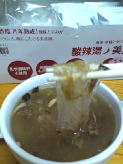 1食置き換えダイエット決行中。「酸辣湯美食麺」1食86kcal。 酸辣湯が美味しくて飽きずに毎日食べています。辛さと酸味がいい感じです。しかも、この暑い時期に熱いものを食べるので吹き出す汗、汗、汗。身体も温まり、デトックスされている気がします。