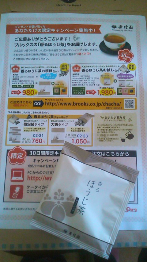 無料サンプルでいただきました。 注文から到着まで6日。 5袋封入されていて1袋のテトラパックで2杯半はいけます。 味は普通のほうじ茶。 でも苦味が少ないので飲みやすい。 商品名にあるように『香り』はとても良いです。 【ブルックスの日本茶ブランド幸修園】 http://www.brooks.co.jp/top/c_ni.php