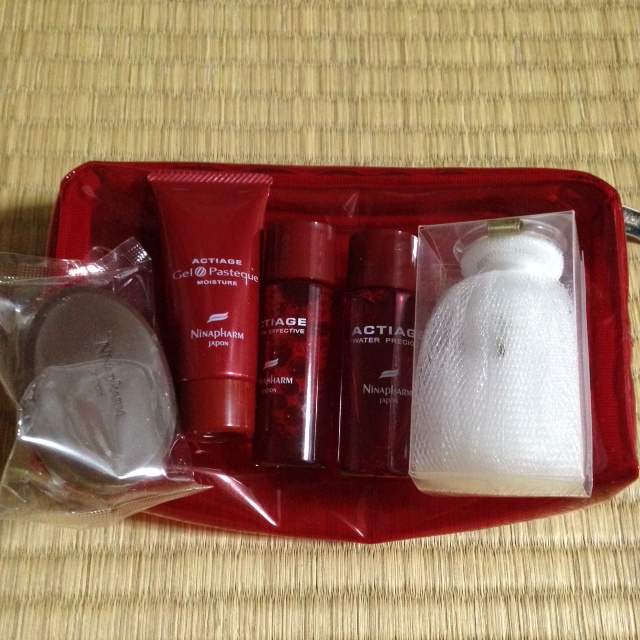 キレイナビさんのモニターに当選して使わせていただいた アクティアージュのお試しセット! 赤いポーチの中に、泡立てネット、洗顔石けん、化粧水、美容液、ジェル状クリームが入っていました。 泡立てネットを使うと、きめの細かい泡がたって、お肌がつるりと洗い上がりました。 でも、潤いはのこっているので、すぐに化粧水、美容液、で保湿をしました。どれもさらりとしたつけ心地で、肌にスーッとなじみました。 最後に、クリーム。 クリームもジェル状なので肌へのなじみもよく、べたつきがないのでとても...