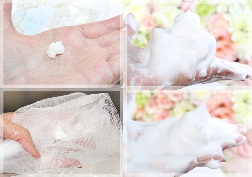 白色の光沢のある洗顔フォームです。 泡立てネットを使ってあわだててみました。 とても泡立ちがよく、簡単にキメ細かい濃密な泡を作れます。 泡質は、キメが細かくて超クリーミー。 毛穴の奥まで入りこんで、汚れをしっかり落としてくれます。 すすぎはじめると、さーっと泡が流れ落ちる泡切れの良さ。 すぐに肌がキュキュッとなるさっぱりした洗い心地。 さっぱり系ですが、洗顔後のつっぱり感はなく、 しっとり潤いをキープしてくれます。 無添加なので、刺激の無いやさしい使用感です。