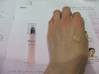 コットンに出してみると、かわいいピンクの容器からは想像できない茶色い液体。でも、肌なじみもよく、香りもローズを基調とした良い香り。乾燥肌にどんどん吸収されていく感じでした。