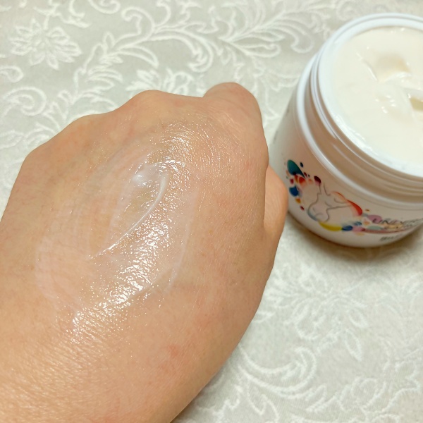 トロンとなめらかなテクスチャーで、肌に付けてみると、とてもみずみずしい印象のクリームです