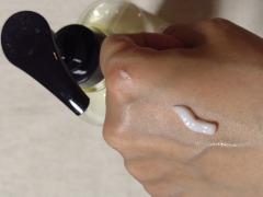 ガラスのプッシュタイプのボトル。 中身のキラキラした色が見えるのが素敵。 中身は、とろっとややゆるめなテクスチャー。 すっとスムーズになじみ、べたつかない。 しっとりとするような使い心地でハリツヤ(個人の体験による) シトラス系やハーブによるさわやかな香りがふわっとただよって素敵。 べたつかないので朝晩使いやすいので気に入ってます。