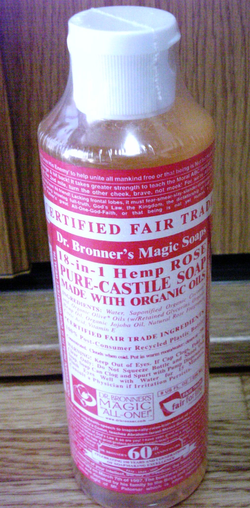 マジックソープは米国ドクターブロナー社製の100%天然のオーガニック(有機栽培)ソープで、米国で売上NO.1の実績をもつ人気商品だそうです。 洗顔からクレンジング、ボディ洗浄とこの一本で顔からボディまで使え、しかも毛穴の黒ずみやメイク落としにも使ます。 薔薇の香りでちょっと贅沢な気分でお風呂を楽しめます