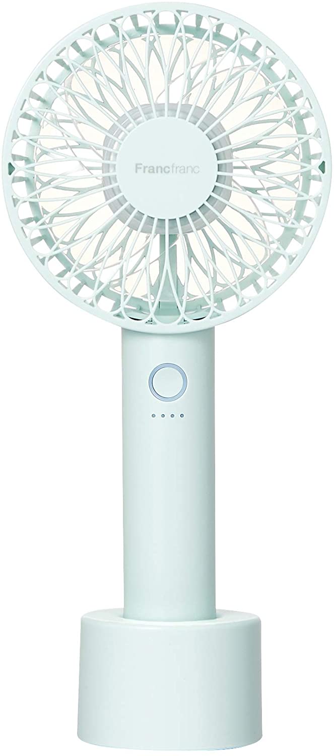 卓上型でも携帯型でも2通り使えるフランフランのハンディファン。ボタンひとつで5段階の風量調節できる優れモノ。USBと充電池どちらにも対応しているのも使いやすいポイントのひとつです。パソコンのUSBポートからも充電できます。別売りの専用パーツを使うことで更に便利な使い方ができますよ。