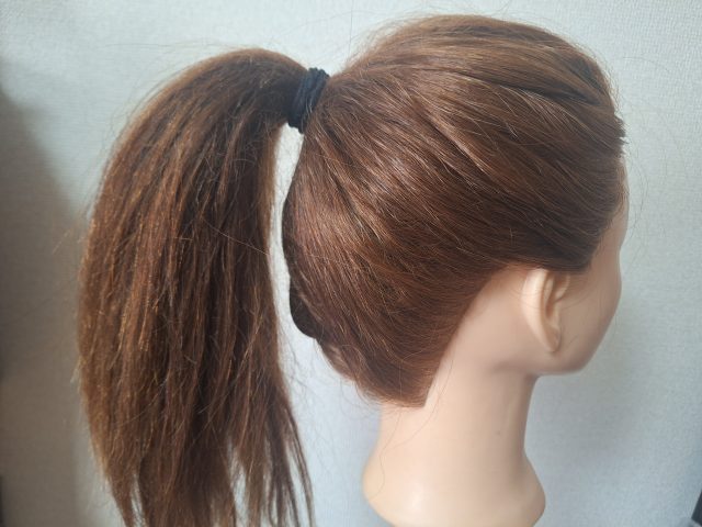 ⑴髪をお好みの位置でざっくりまとめたら、ゴムで結んでポニーテールにします。