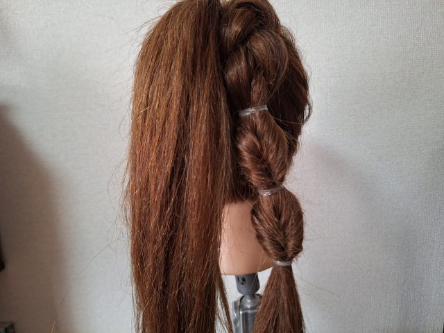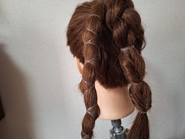 ⑶2~3cmほど間を空けてゴムで結び、くるりんぱします。
