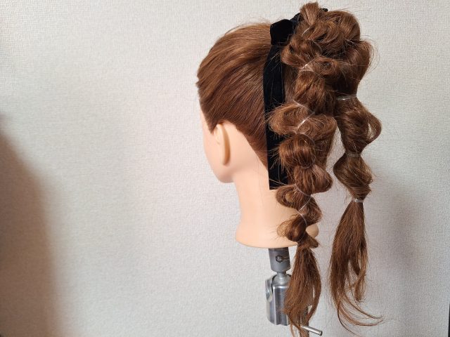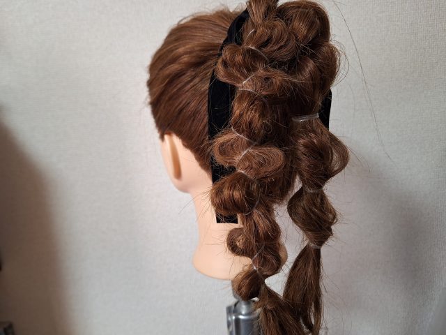 ⑸全体のバランスを見ながら髪を引き出し、ポニーテールの根元にリボンを付けたら完成です。