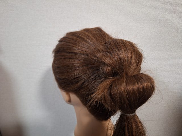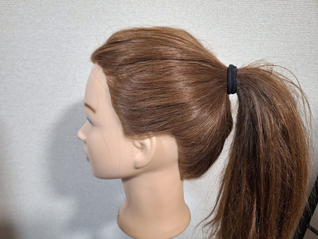 ⑴今回はポニーテールで作っていくので、髪を高めの位置でまとめてゴムで結びます。