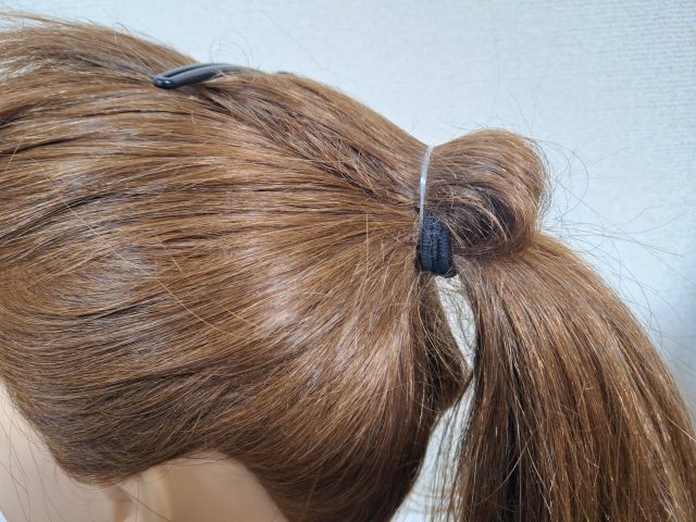 ⑶ダッカールを外して髪をおろし、お好みの幅でゴムを結びます。