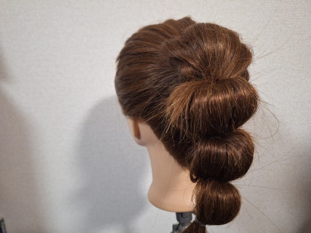 ⑵毛先を半分上にあげてダッカールなどでとめて、最初に結んだゴムの上の位置で結びます。