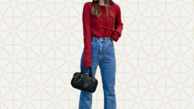 スカートやキレイめのパンツと合わせて上品にまとめるのも素敵ですし、デニムとの相性も抜群なので写真のようにデニムに合わせてラフに着こなすのも素敵ですよ!どのようなボトムスを合わせても赤色が大人っぽさをしっかりと出してくれます。