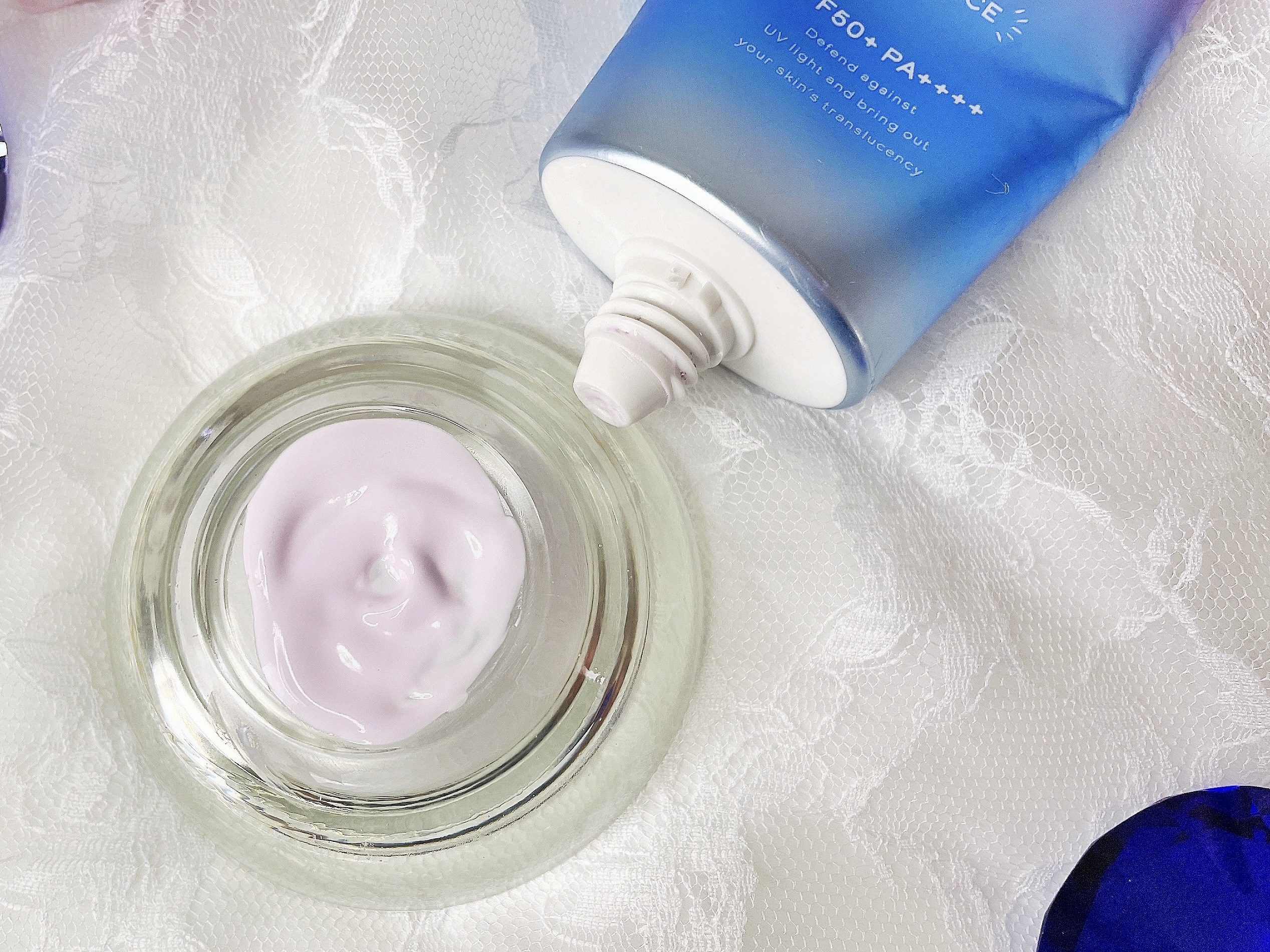 透明感ブルーと血色感ピンクを組み合わせたラベンダーで涼やかに整えて、白浮きせず、肌の透明感を段違いにアップさせることができます。
