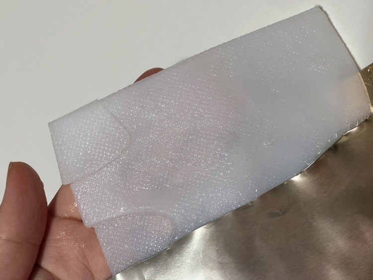 開けてみるととてもびっくりな構造になっています。最初は美容液たっぷりの分厚いシートが出てくるのですが、こちらは保護シートとなっています。