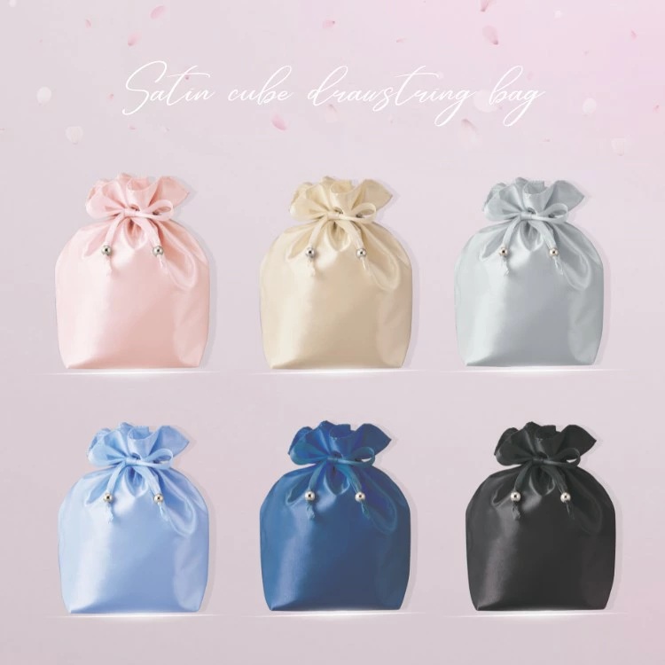 サテンキューブ型巾着 広いマチがついており、自立もするサテン素材の巾着です。 光沢のある素材で高級感があるので、大人の女性にもぴったり。おしゃれな6色がラインナップされています。