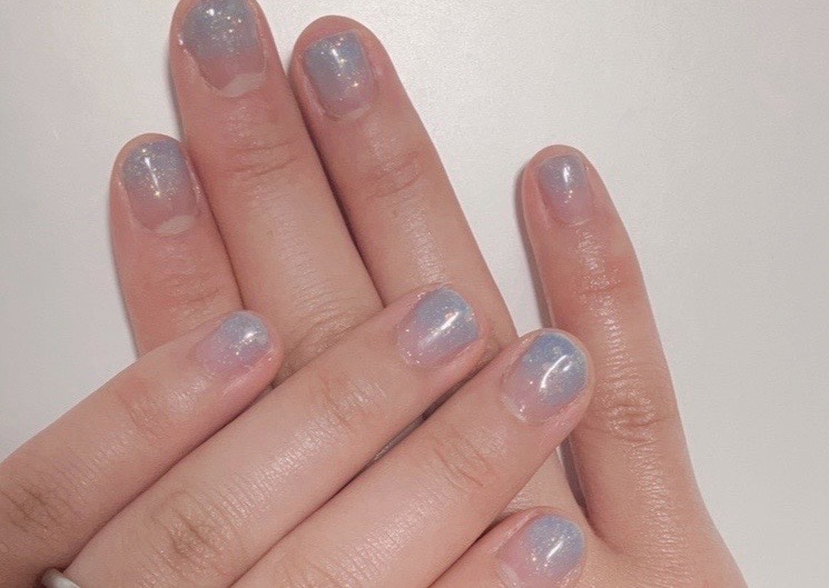 グラデーションネイルは難しそうなイメージがありますが、このカラーなら大丈夫。ラメが塗りムラを上手にカバーしてくれるうえ、淡い色味なので多少塗りすぎても目立ちにくいんです。