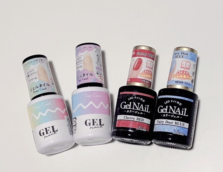 最後に今回使ったジェルネイルのカラーは、すべて百均で購入したもの。想像以上にカラーバリエーションが豊富で、「これで本当に百均?」と思うほどセルフネイルを楽しめました。