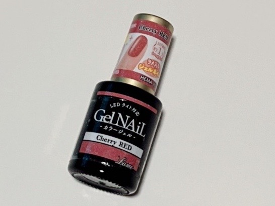 セリアで購入しました。チェリーレッドと書いてありますが、実際に塗ってみた色は赤よりも深いピンクのような印象です。