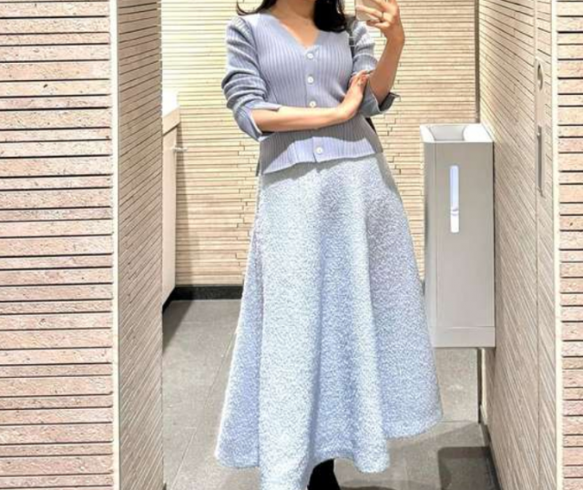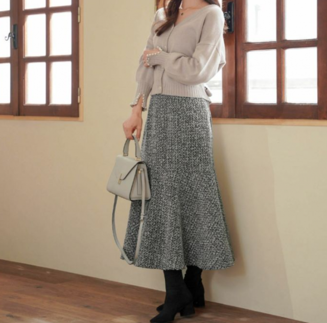 コンパクトな丈のニットやカーディガンと合わせると、万人受けする上品なコーデになりツイードスカートのAラインがキレイに出ることでスタイルの良さも際立つでしょう。