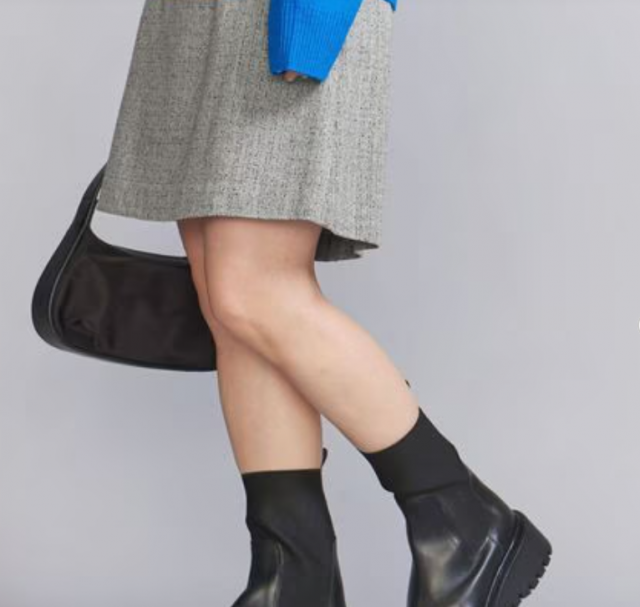 ロングブーツと合わせることで、実際の年齢よりも若々しく、快活な印象に見える、「ミニ丈」のツイードスカート。