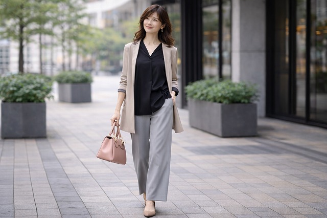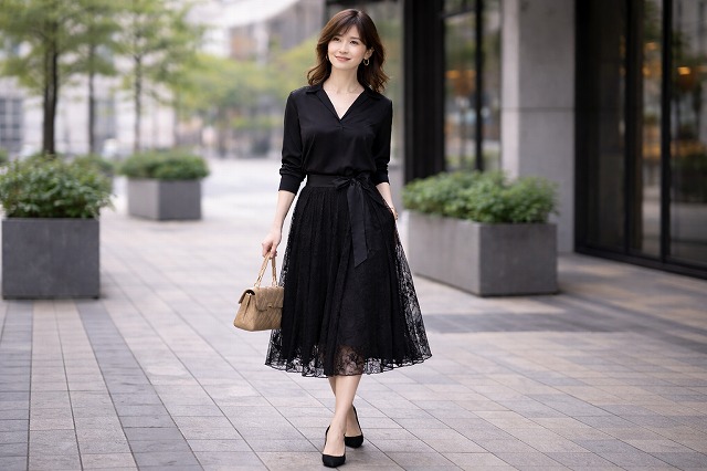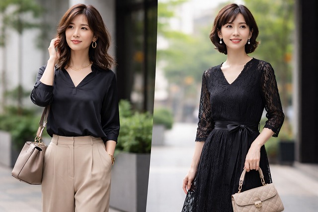 バッグや靴、インナーで少し色を足すだけでも、印象は驚くほど変わります。「黒を着る=黒だけでまとめる」必要はない、ということを覚えておきましょう。