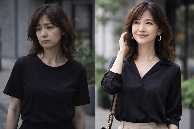 黒を味方につけて、大人の若見えスタイルへ黒は、40代女性にとって心強い味方である一方、使い方を間違えると老け見えを招きやすい色でもあります。大切なのは、顔まわりの明るさ、素材とシルエット、全身バランスと抜け感。この3つを意識すること。