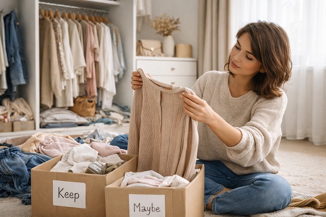 大切なのは、「どんな服を残したいのか」を自分の中で明確にすることです。今の体型や生活に合っていて、着たときに気分が上がり、手持ちの服と自然に組み合わせられる服。そうした基準を意識して見ていくと、残す服がはっきりしてきます。