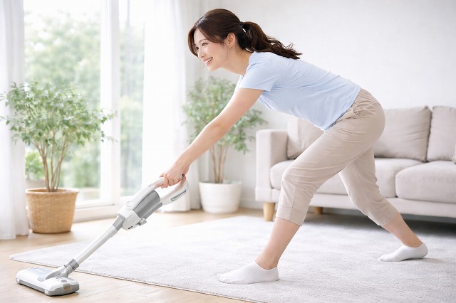 掃除機をかける際に腕を大きく動かしたり、一歩を大きく踏み出すことで、運動量を簡単に増やすことができます。