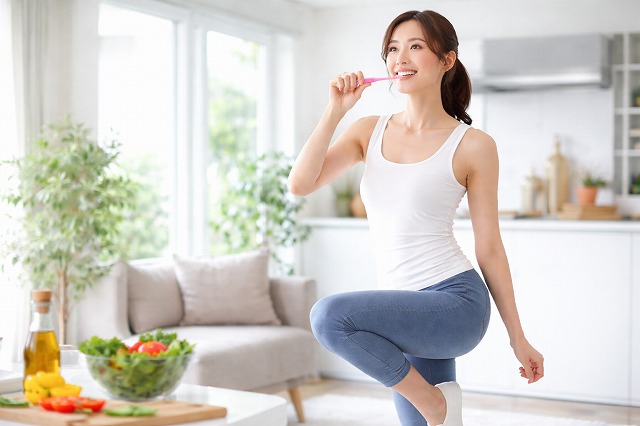 歯磨きは1日2回以上行う習慣だからこそ、活用しない手はありません。片足立ちを取り入れることで、自然と体幹が鍛えられ、バランス力も向上します。