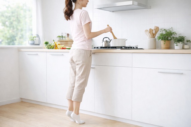 料理中は立っている時間が長く、工夫次第で効率よく体を動かせる時間です。待ち時間にかかとの上げ下げを繰り返したり、軽く膝を曲げ伸ばしするだけでも、ふくらはぎや太ももに刺激が入ります。