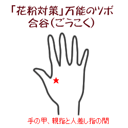 花粉対策:!合谷(ごうこく)のツボ 花粉症にも効くツボシリーズをご紹介します。