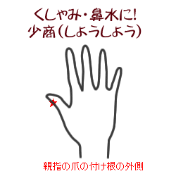 くしゃみ・鼻水に:少商(しょうしょう)のツボ 花粉症にも効くツボシリーズをご紹介します。