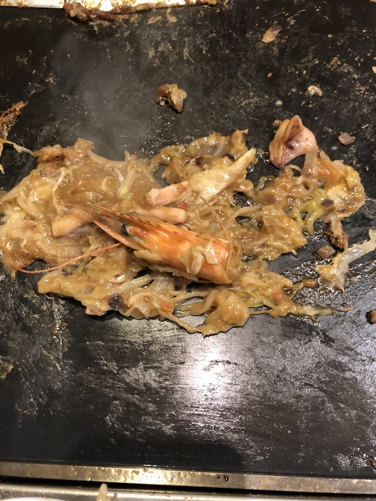 もんじゃ焼きは回転がよくないと光熱費、人件費がでないんじゃないか?と思いながら、トムヤムクンもんじゃ焼き食べて味は濃かったが発汗してぬけた塩分を摂取できてよかった
