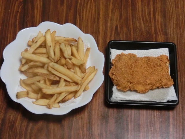 ファーストキッチンのアプリで当選した、フライドポテトの無料券と、スマートニュースのアプリで当選した、ファミマのファミチキが夕飯でした。友人が「チキンバスケットだね」とヽ(=´▽`=)ノ