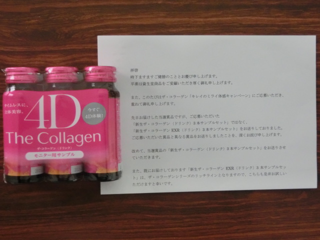 数日前に、コラーゲンドリンクのサンプルセットが届いたのですが、応募した賞品と異なる賞品をお送りしましたと、メールが届いていて、改めて当選賞品を送って頂きました。よかった、以前もらったものは、そのまま頂けます。10万人サンプリングというけど、全員に送り直しているのでしょうか?